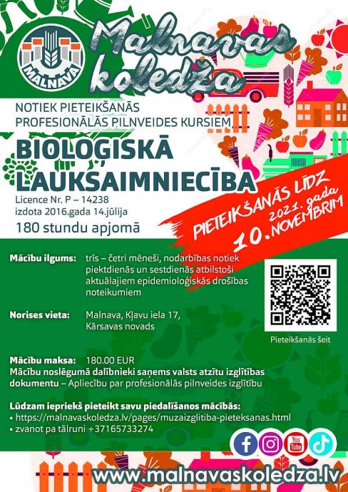 Malnavas koledžā notiek pieteikšanās profesionālās pilnveides kursiem “BIOLOĢISKĀ LAUKSAIMNIECĪBA” (Licence Nr. P – 14238 izdota 2016. gada 14. jūlijā) 180 stundu apjomā.