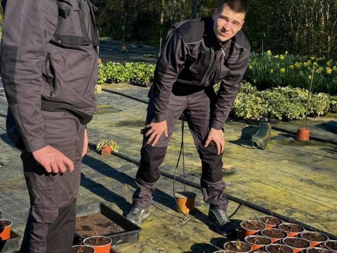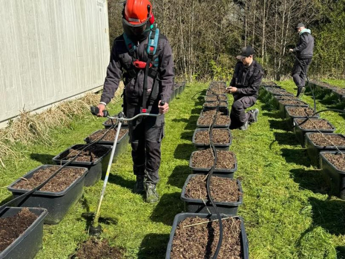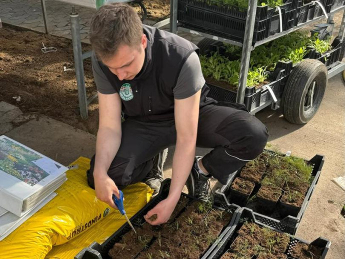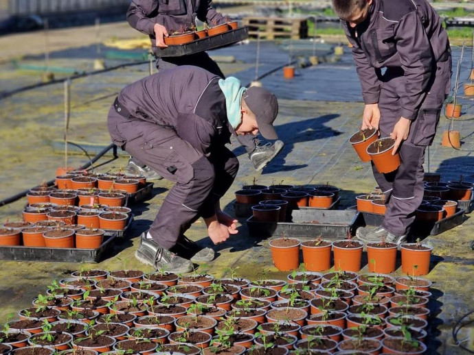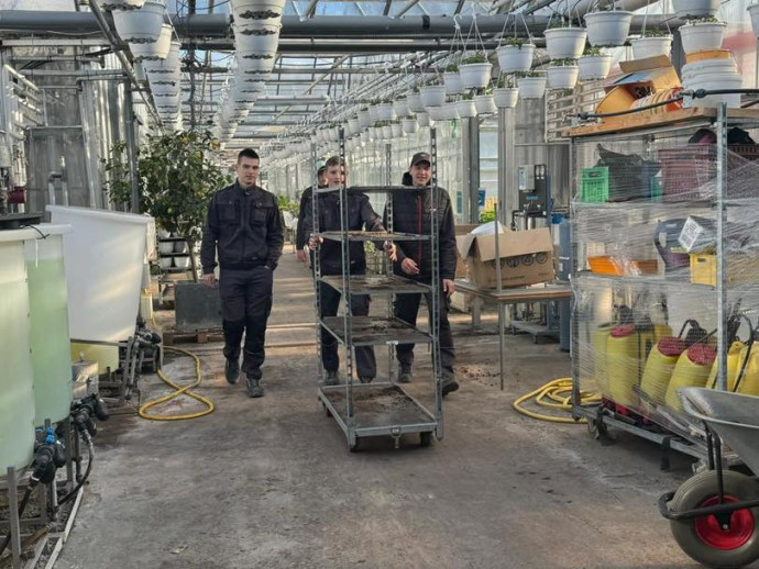 Jaunieši pārklāja stādus āra platībās ar agroplēvi un pievienoja laistīšanas sistēmas augļkokiem, grupējot tos pa pozīcijām. Visbeidzot viņi veica kannu dalīšanu un pārstādīšanu.