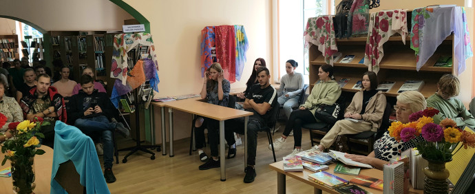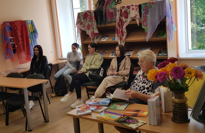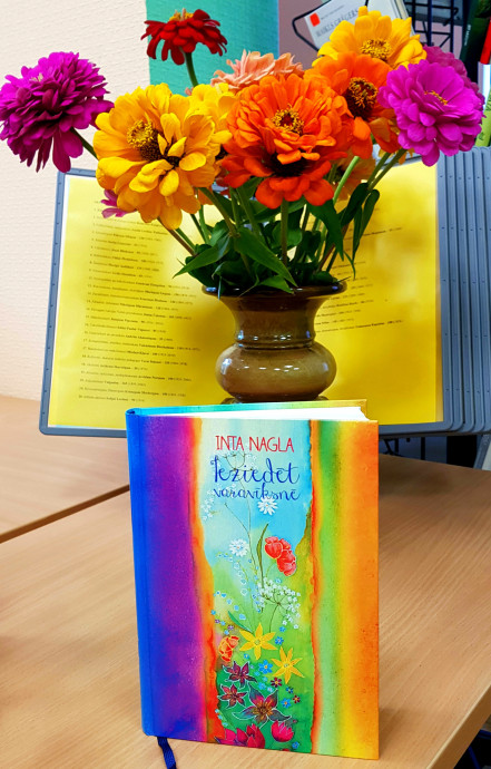 Inta ir dzejniece ar mākslinieces dvēseli – mums bija iespēja aplūkot arī viņas apgleznotos košos zīda lakatus, kā arī klausīties jautros bērnu dzejolīšus no autores pašas ilustrētās grāmatiņas “Mazās Frejas jautrās dzejas”.