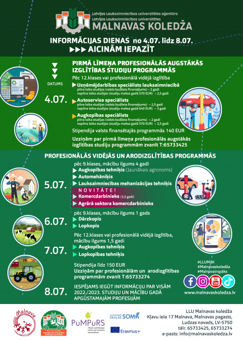 Šogad no 4.-8.jūlijam Latvijas Lauksaimniecības universitātes Malnavas koledža vērs savas durvis visiem interesentiem Informatīvo dienu ietvaros.