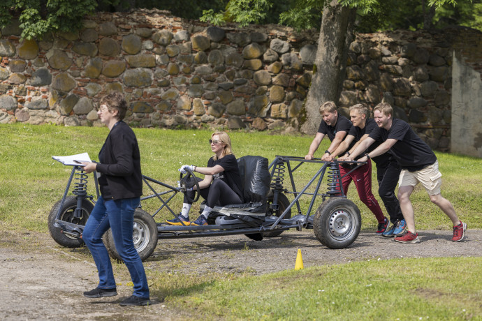 “Greizie rati” – Komandas pierādīja veiklību un sadarbību, stūrējot un stumjot bagiju pa šķēršļotu un mākslīgi veidotu trasi, apbraucot konusus. Katrs dalībnieks pārbaudīja savas braukšanas iemaņas.