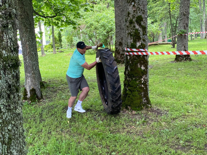 “Riepu slaloms” – Komandas pārbaudīja spēku un veiklību, ripinot traktora riepas pa noteiktu šķēršļu joslu.