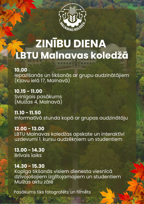 - 12.00–13.00 LBTU Malnavas koledžas apskate un interaktīvi uzdevumi 1.kursu audzēkņiem un studentiem
