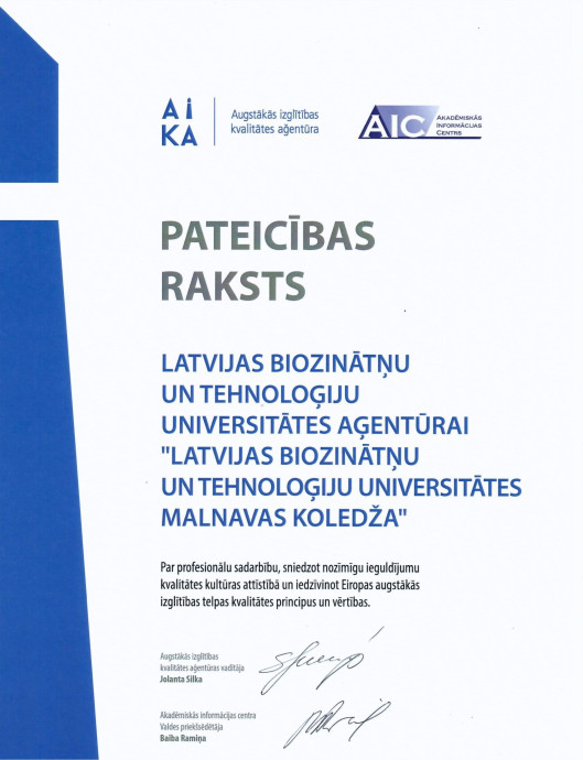 Pasākuma noslēgumā sadarbības partneri, tostarp LBTU Malnavas koledža, saņēma AIKA pateicības rakstu par ieguldījumu kvalitātes veicināšanā augstākajā izglītībā.
