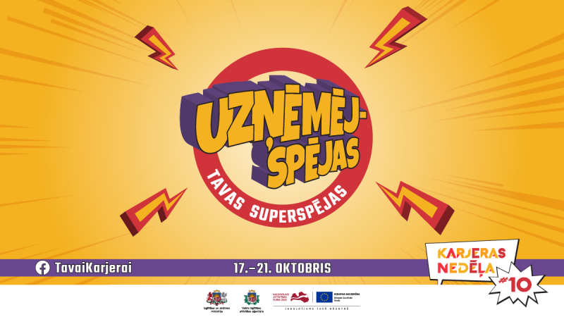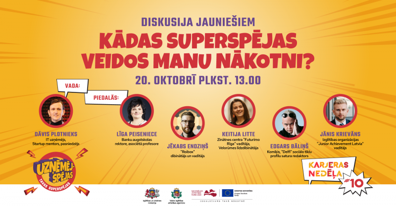 | 20.10.22. | 13:00 | Tiešaistē @TavaiKarjerai Diskusija jauniešiem “Kādas superspējas veidos manu nākotni?” | Saruna par nākotnes profesijās aktuālajām spējām, prasmēm un kompetencēm. Salīdzinājums ar pašreiz pieprasītajiem speciālistiem un darba vidē augstāk novērtētajām darbinieku spējām un prasmēm. Integrēta iedvesmojošu video skatīšanās, pēc tam pārrunājot video varoņu pieminētās “superspējas” jeb savas spēcīgās prasmes, un vai tās būs aktuālas arī turpmāk. Diskusija par skolas un ārpus tām piedāvātām aktivitāšu daudzveidību, kā tās palīdz jauniešiem attīstīt nākotnē noderīgas prasmes. Moderators: Dāvis Plotnieks, iedvesmojoša personība, uzņēmējs, Karjeras nedēļas 2021 hakotona vadītājs https://www.facebook.com/TavaiKarjerai -skatāms online fb kontā | 1.-4.kurss |