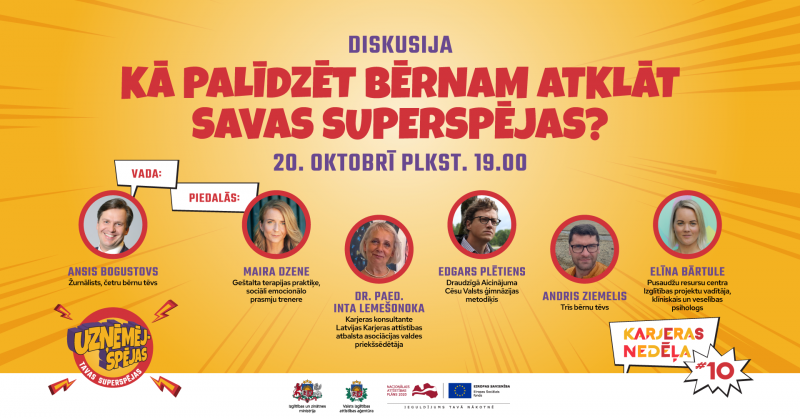 | 20.10.22. | 19.00 | Tiešaistē @TavaiKarjerai Diskusija vecākiem un ģimenes locekļiem. “Kā palīdzēt bērnam atrast savas superspējas” | Saruna par bērnu un jauniešu stipro pušu atpazīšanu – ko var darīt vecāki, kā aizņemtā ikdienā saprasts, kādas ir bērna intereses un spēcīgās puses, un kā tās var tikt attīstītas? Diskusija par dažādu ārpusskolas nodarbību un aktivitāšu veidiem, kas ir viens no virzieniem spēju attīstīšanā. Kā uztvert kļūdīšanos un kā kopīgi konstruktīvi izvērtēt situāciju, lai kļūdas taptu par izaugsmes pamatu? Mācību priekšmetu pedagogu un vecāku sadarbība bērna īpašo spēju un prasmju atklāšanā un attīstīšanā. Moderators: Ansis Bogustovs, Ētera personība, četru bērnu tēvs https://www.facebook.com/TavaiKarjerai -skatāms online fb kontā | Skolēnu vecāki un ģimenes locekļi |